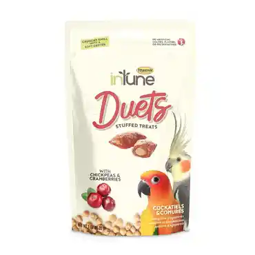 Higgins inTune Duets stuffed treats, combine two tasty textures birds love: A crunchy outside shell with a soft treat filling. Our vegetarian recipe is made with chickpeas as the number one ingredient and cranberries for a flavor your companion bird will enjoy. Chickpeas are rich in nutrients and support overall health. inTune Duets are also free of any artificial preservatives, colors and flavorings.