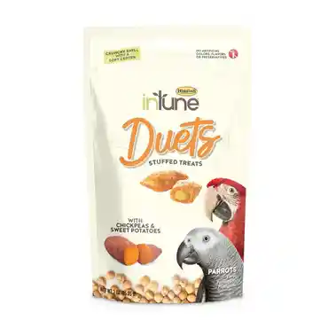 Higgins inTune Duets stuffed treats, combine two tasty textures birds love: A crunchy outside shell with a soft treat filling. Our vegetarian recipe is made with chickpeas as the number one ingredient and sweet potatoes for a flavor your companion bird will enjoy. Chickpeas are rich in nutrients and support overall health. inTune Duets are also free of any artificial preservatives, colors and flavorings.