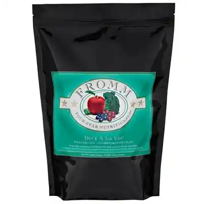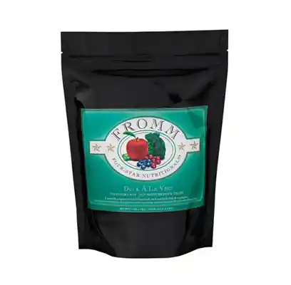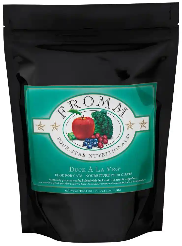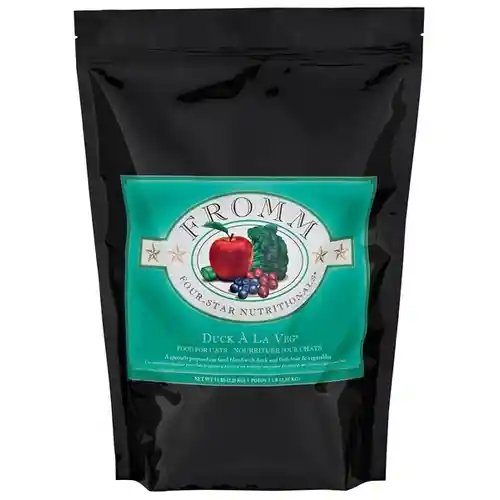 Keeping the needs of your cat in mind, Fromm Four Star Duck A La Veg Dry Cat Food is made to support all breeds in all stages of life. Made with high amounts of protein paired with fresh produce including sweet potatoes, broccoli, apples, and carrots to provide high quality, easily digestible carbohydrates. Fromm Four Star Duck A La Veg Dry Cat Food provides well rounded, balanced nutrition for your furry friend without the unnecessary fillers! This recipe also supports the health of your cat's coat and skin with guaranteed levels of Omega fatty acids and is enhanced with probiotics to ensure that their digestion is right on track! Fromm Four Star Duck A La Veg Dry Cat Food is made with quality ingredients found in the United States with no artificial colors, flavors, or preservatives that any cat is sure to love!