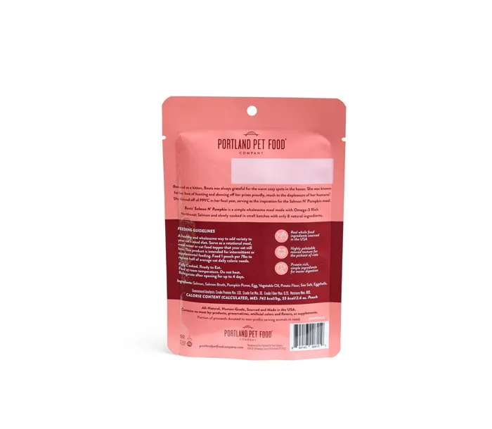 Boots' Salmon N' Pumpkin is a human-grade, nourishing meal made with Omega-3 Rich Northwest Salmon and slowly cooked in small batches with only 8 natural ingredients. All of Portland Pet Food Company's meals are 100% natural, USA sourced and made, ready-to-eat homestyle, shelf stable cat meals/meal toppers. These meals are sourced from human-grade, all natural meat raised without antibiotics or hormones so you can add variety and flavor to your cat's diet. The pouches are shelf-stable for two years, Earth friendly, and BPA free so you can feel good while your cat eats well.