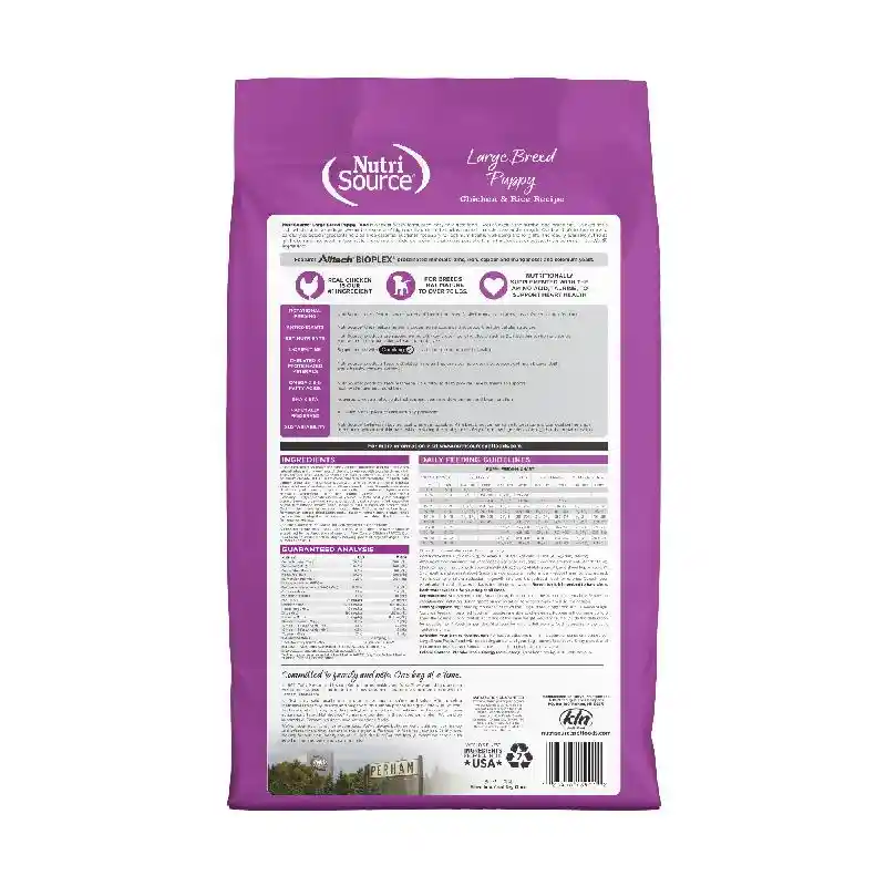 With the needs of puppies expected to be larger than 50 pounds full grown in mind, NutriSource Large Breed Puppy Chicken and Rice Dry Dog Food utilizes a holistic, easy to digest recipe for ideal health maintenance in large breeds. This recipe is made with humanely certified chicken along with other high quality ingredients providing perfectly balanced nutrition your pup is sure to love! Nutrisource recipes always include their Good 4 Life system with ingredients that work together to promote gut health often showing health improvements within the first feeding!