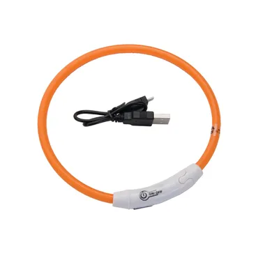Enhance the safety and visibility of your nighttime walks with the USB Light-Up Neck Ring! This innovative neck ring offers 360-degree illumination, ensuring maximum visibility in all weather conditions. Its bright, waterproof design is perfect for rain or shine. Putting the ring on is a breeze; simply snap the ends together alongside your dog's favorite collar. You can customize the fit by easily cutting the material to your dog's specific size. The ring features three eye-catching light settings, effortlessly switchable with a simple power button. You can use the ring for up to five hours with the flashing setting or 3 hours on the continuous light setting before it's time to recharge. The USB charger is included with your order and takes approximately 40 minutes to restore the ring's power. Ensure the safety of your dog during nighttime strolls with this essential light-up accessory!