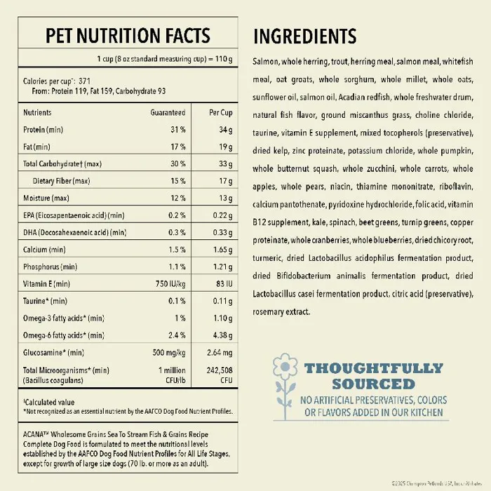 ACANA always goes above and beyond when it comes to crafting nutritious recipes. ACANA Wholesome Grains Sea to Stream Fish & Grains recipe is packed with delicious raw herring, mackerel, catfish and redfish, and complemented with wholesome grains like oats, sorghum, and millet. These grains are high in fiber and gluten-free, offering added nutrition that helps support a healthy digestive environment.