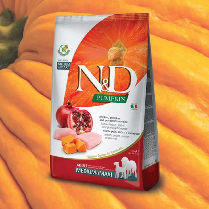 SUPPORTS PET HEALTH. N&D Pumpkin Chicken & Pomegranate Canine Medium/Large Breed is a complete and balanced diet for all life stages with 96% of the protein from animal source formulated to meet the nutritional levels for maintenance. Made with Non-GMO and human-grade fresh (never frozen) ingredients like free-range chicken, free-range eggs, sustainably sourced wild-caught herring, pumpkin and pomegranate. Low glycemic index, grain-free and gluten-free recipe with no legumes, potato, soy, meals, by-products, hormones, antibiotics, or artificial preservatives. Made with natural antioxidants, prebiotics, glucosamine and chondroitin. All formulations are scientifically-proven and clinically-tested thru certified cruelty-free research. Guaranteed over 90% digestibility. THE ONLY KIBBLE FILLED WITH COLD INJECTED LIFE ESSENTIALS (dehydrated fruits and vegetables, botanicals, vitamins, and minerals are vacuum-infused cold-pressed into the kibble after cooking). Nitrogen filled bags to prevent the food from oxidation. All packaging is recyclable and BPA-Free.