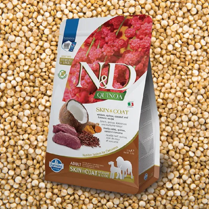 ALLERGIES? ITCHING? HOT SPOTS? N&D Quinoa Skin & Coat Venison Canine is a complete and balanced diet with 94% of the protein from animal source formulated to meet the nutritional levels for maintenance. A special functional L.I.D. formula designed for dogs with food sensitivities/intolerances useful for restoring and maintaining skin and coat well-being. Made with Non-GMO and human-grade fresh (never frozen) ingredients like free-range venison, organic quinoa, coconut and turmeric. Low glycemic index, rich in zinc, high level omega 3 & 6 fatty acids, grain-free and gluten-free recipe with no legumes, potato, soy, meals, by-products, hormones, antibiotics, or artificial preservatives. Made with natural antioxidants, prebiotics, glucosamine and chondroitin. All formulations are scientifically-proven and clinically-tested thru certified cruelty-free research. Guaranteed over 90% digestibility. THE ONLY KIBBLE FILLED WITH COLD INJECTED LIFE ESSENTIALS (dehydrated fruits and vegetables, botanicals, vitamins, and minerals are vacuum-infused cold-pressed into the kibble after cooking). Nitrogen filled bags to prevent the food from oxidation. All packaging is recyclable and BPA-Free.