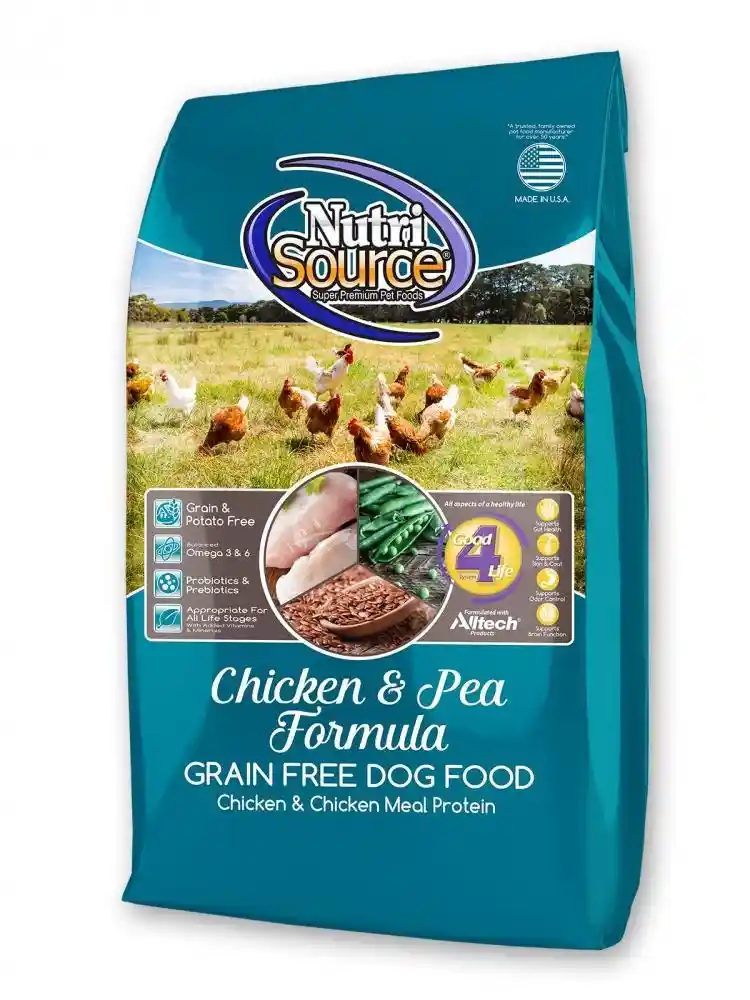 NutriSource Grain Free Chicken & Pea Dry Dog Food utilizes a holistic, easy to digest recipe for ideal health maintenance in all breeds and life stages. This grain free recipe is made with fresh, animal protein from the USA along with other high quality ingredients providing perfectly balanced nutrition your pup is sure to love! Nutrisource recipes always include their Good 4 Life system with ingredients that work together to promote gut health often showing health improvements within the first feeding!