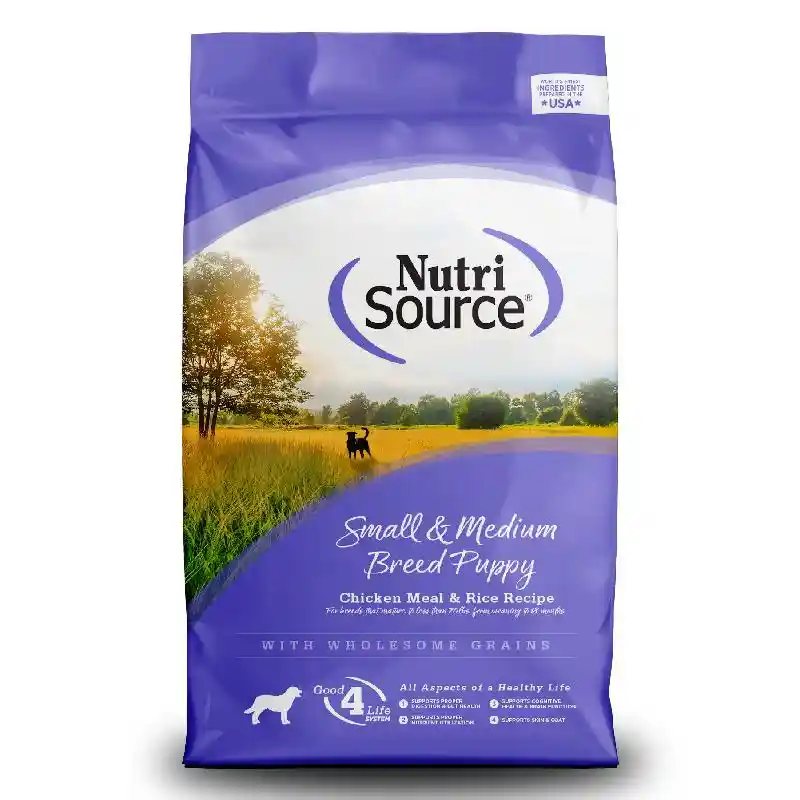 Made for puppies expected to weigh less than 50 pounds full grown, NutriSource Small and Medium Breed Puppy Chicken and Rice Dry Dog Food is a holistic and easy to digest recipe created with higher levels of protein and fat that growing puppies need! Humane certified chicken and other high quality ingredients are key in this recipe to ensure your puppy is getting the best nutrition available for optimal growth and development. Nutrisource recipes always include their Good 4 Life system with ingredients that work together to promote gut health often showing health improvements within the first feeding!