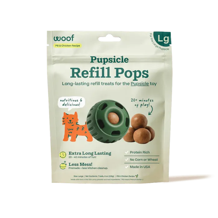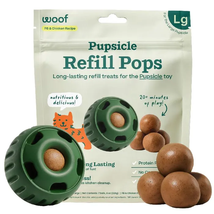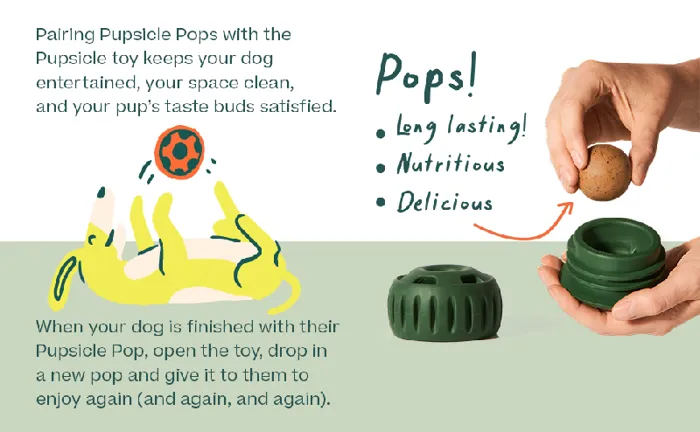These are long-lasting, mess-free, and convenient treats designed to be used with the Pupsicle toy. They are made in the USA with human-grade ingredients and contain 7 pops in a large bag. Pupsicle Pops are shelf-stable and don't need refrigeration, making them suitable for travel.