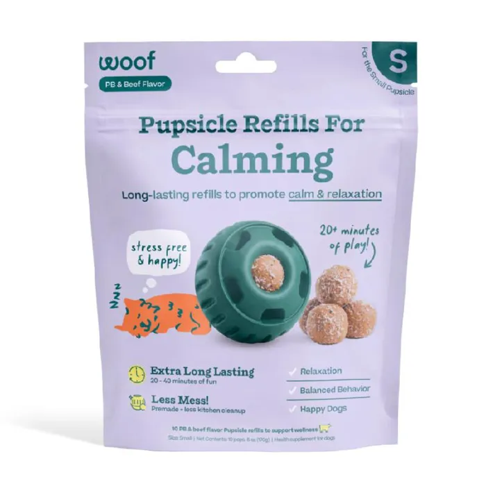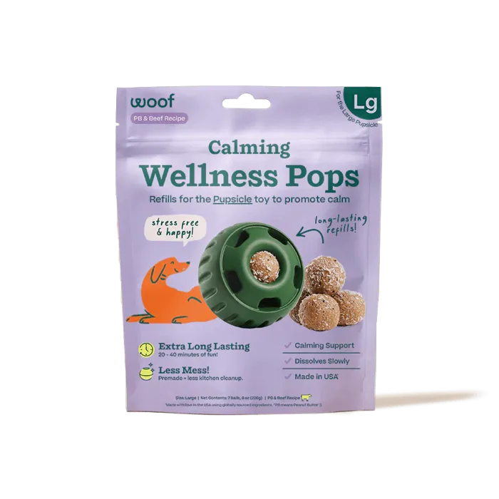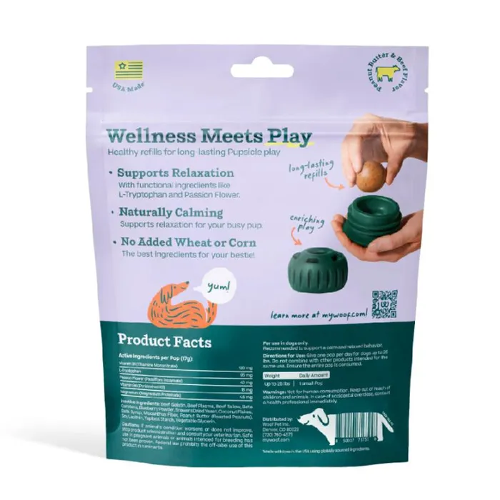 Indulge your pup with Woof Pupsicle Pops Refills Calming Beef Grain-Free Large Lickable Dog Treats. Each delicious treat is made in the USA with high-quality ingredients to nourish your furry friend. These calming pops provide 20-40 minutes of happy playtime, with the added benefit of essential nutrients to help your four-legged family member relax. Each pop contains soothing ingredients like passion flower to promote a sense of calmness. These all-natural treats are shelf-stable and don’t require refrigeration, but they can be frozen for longer-lasting freshness. Give your pup a nutritious distraction with WOOF Pupsicle Pops, so you can enjoy some uninterrupted me-time. It’s a win-win for both pet parents and their pups!