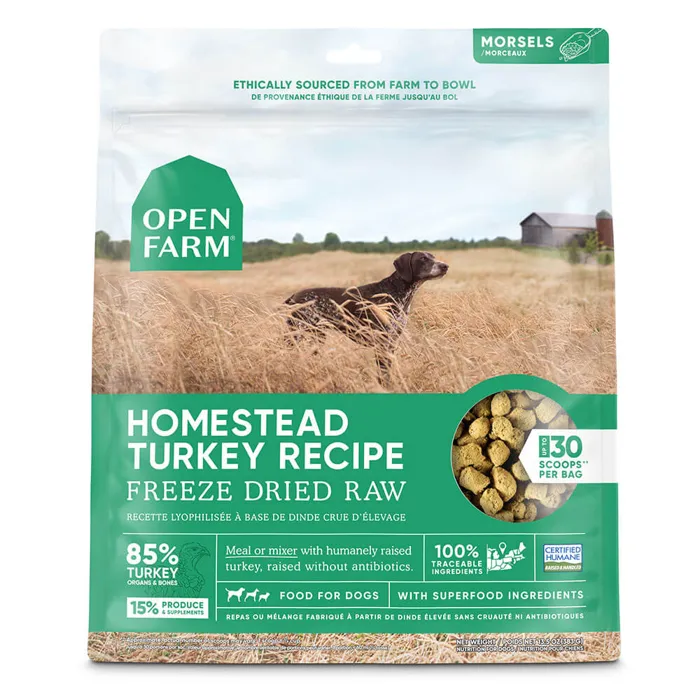 Easy to serve and hard to resist. This high protein topper or complete meal is packed with humanely raised antibiotic-free raw turkey. For added nutritionåÊOpen Farm includes functional ingredients like locally sourced leafy greens, squash and pumpkin seeds, superfoods like coconut oil, and antioxidants like blueberries.