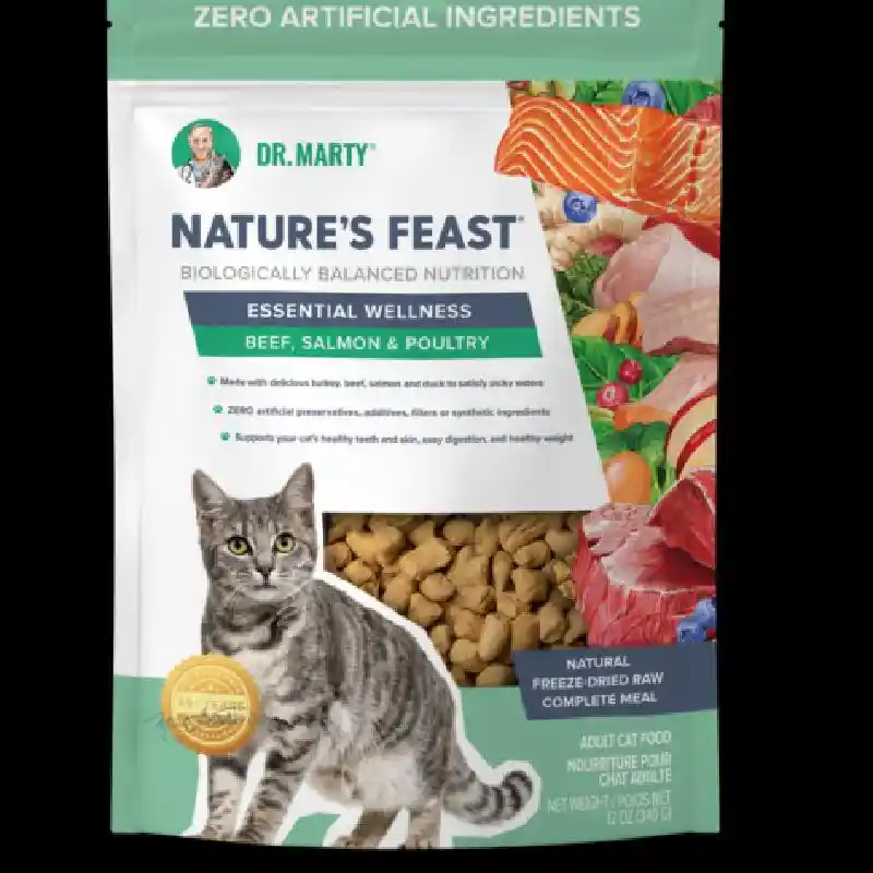 Dr. Marty Nature's Feast Essential Wellness Cat Food, is a premium, freeze-dried raw cat food that provides everything your adult cat needs for a stronger, healthier life. This cat food formula is 100% natural and contains feline-friendly fruits, veggies, and mixed proteins to support energy, good digestion, and smooth skin (and a shinier coat!).