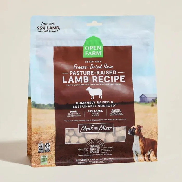 Easy to serve and easy to please. This high protein topper or complete meal is packed with humanely and pasture-raised lamb. For added nutrition Open Farm combines it with functional ingredients like locally sourced leafy greens, squash and pumpkin seeds, superfoods like coconut oil, and antioxidants like blueberries.
