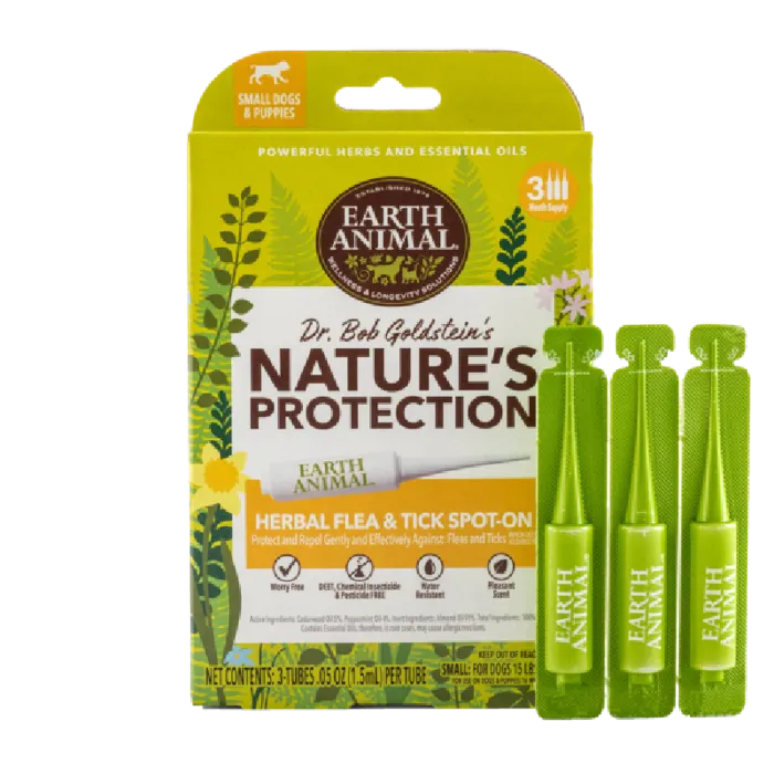 Earth Animal Nature's Protection Herbal Spot-On is a naturally effective alternative to harsh chemical-based flea and tick repellent treatments. Formulated by Dr. Bob Goldstein, this spot-on treatment features a blend of aromatic herbs and soothing essential oils, including 5% Cederwood Oil, 4% Peppermint Oil, and 91% Almond Oil. It provides protection against biting fleas and ticks while also being water-resistant and having a pleasant scent. This small-sized spot-on treatment is perfect for dogs and puppies. Keep your furry friend protected from fleas and ticks with Earth Animal Nature's Protection Herbal Spot-On.