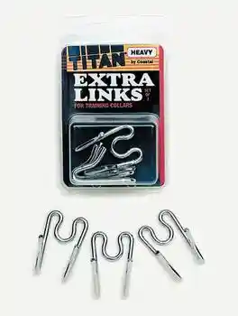 The Titan® Extra Links for Dog Prong Training Collars may be added or removed for proper fit. Available in packs of 3 in fine 2.0 mm, medium 3.0 mm, heavy 3.3 mm, and x-heavy 4.0 mm. Titan chain is argon welded and chrome plated for maximum strength and durability. It will not tarnish, rust or break. Chain training collars are safe, effective training tools with proper use. They are not to be used for tie out.