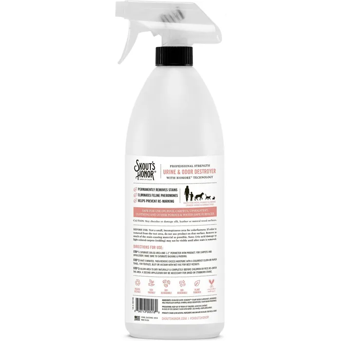 Keep your home clean with Skout's Honor Professional Strength Urine & Odor Destroyer. This hard-working spray performs fast to break down and eliminate both old and new pet urine stains and odors at the molecular level. This eco-friendly spray is safe for use on rugs, carpets, upholstery and clothing for a versatile but strong cleanser. The BioKore technology breaks down the stain while the odor eliminating technology destroys those pungent molecules for a fresh clean scent. Together, these eco-friendly solutions will keep your home unstained and ready for the next slip-up whether it’s urine, vomit, hairball, feces or marking scents.