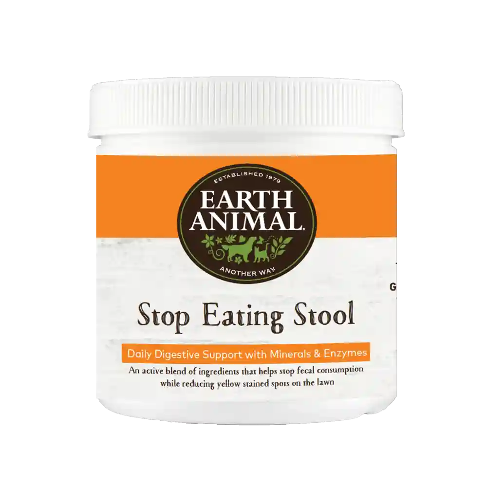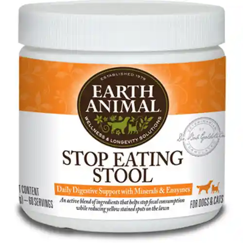 Stop Eating Stool daily supplement is an active blend of nutrients, minerals, and enzymes that offers digestive support and helps stop stool-eating episodes while reducing yellow stained spots on the lawn.