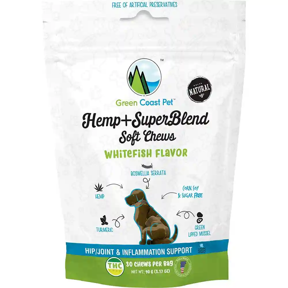 Our whitefish flavored Hemp + SuperBlend soft chews are packed with benefits for your dog along with 2.5mg of PCR Hemp Extract per chew. These chews are soft for easy chewing and cold-extruded meaning that the active ingredients are in their raw format and are not cooked and degraded by being subjected to heat.Â