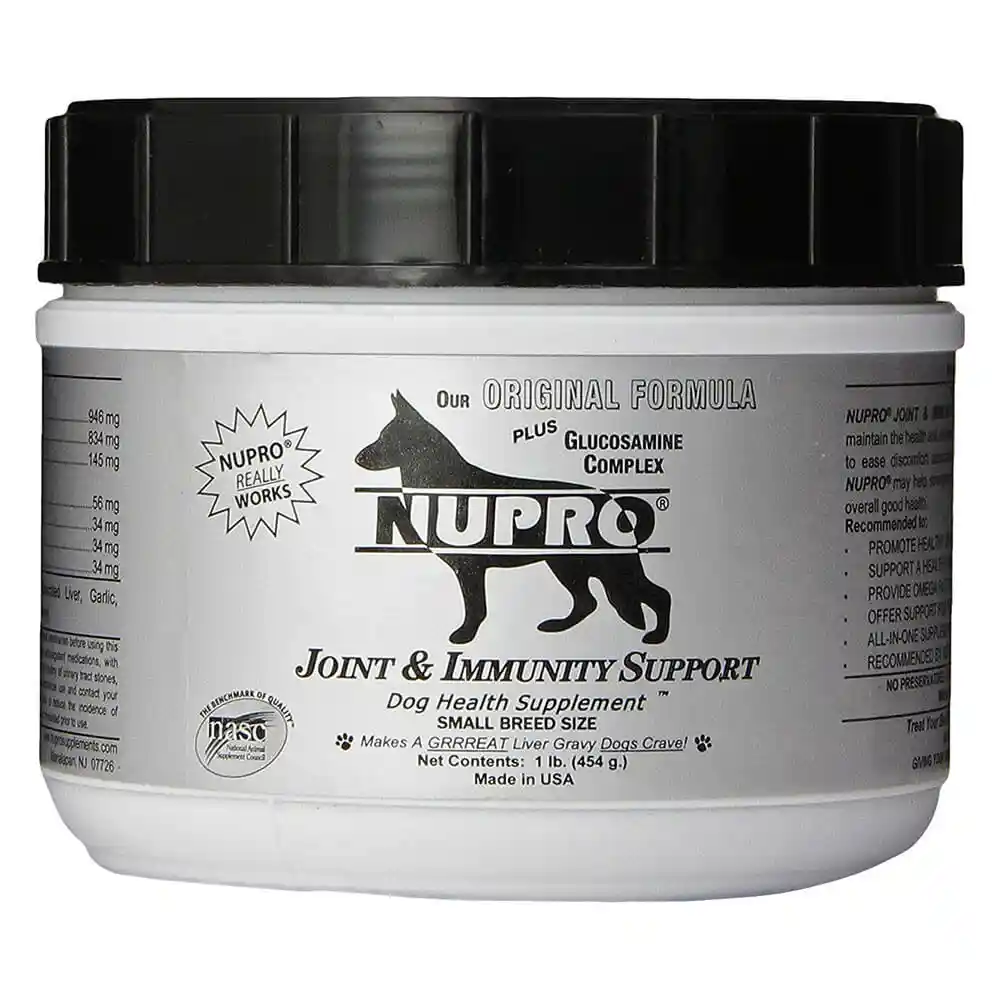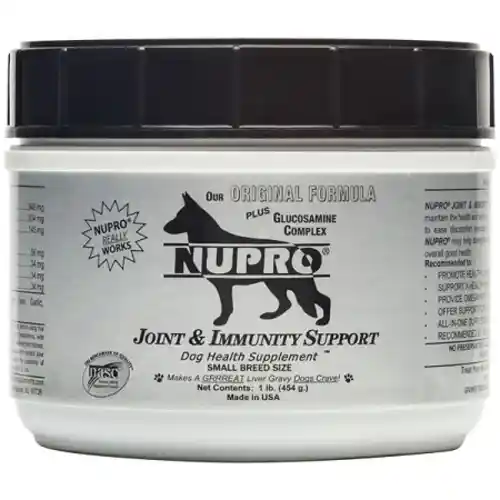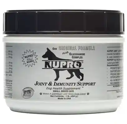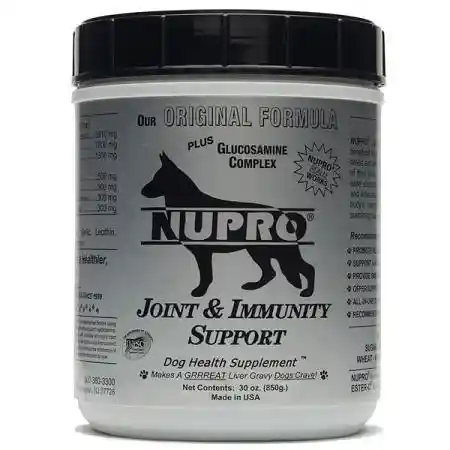 NUPRO Joint & Immunity Support Dog Health Supplement adds Glucosamine Complex, MSM, and Ester-C to enrich our Original "Gold" Formula, especially for the Active and/or Senior animal. Your dog now has the benefit of a scientifically balanced combination of select ingredients specifically formulated to support normal joint structure, function and flexibility as well as promote optimal overall health and well-being.