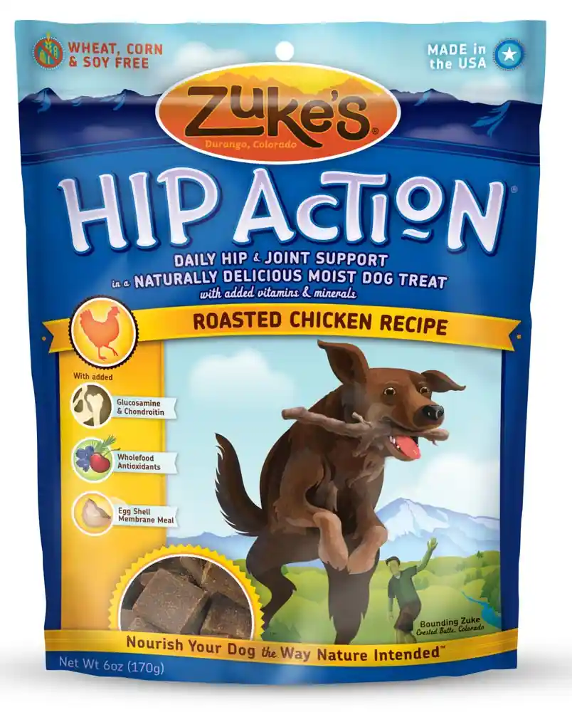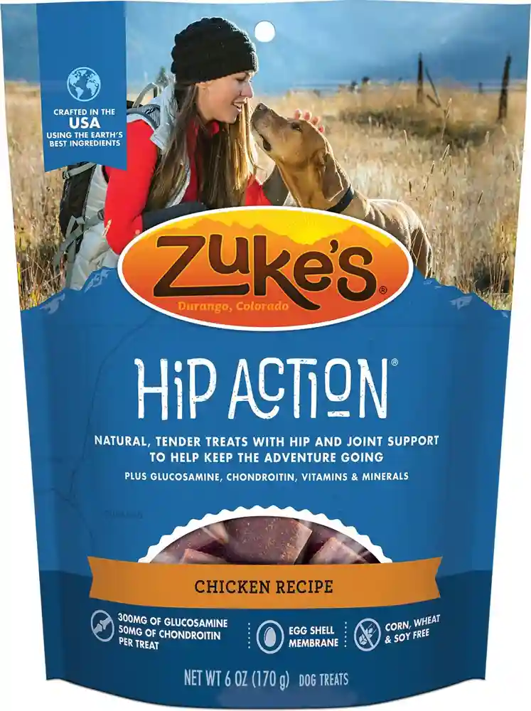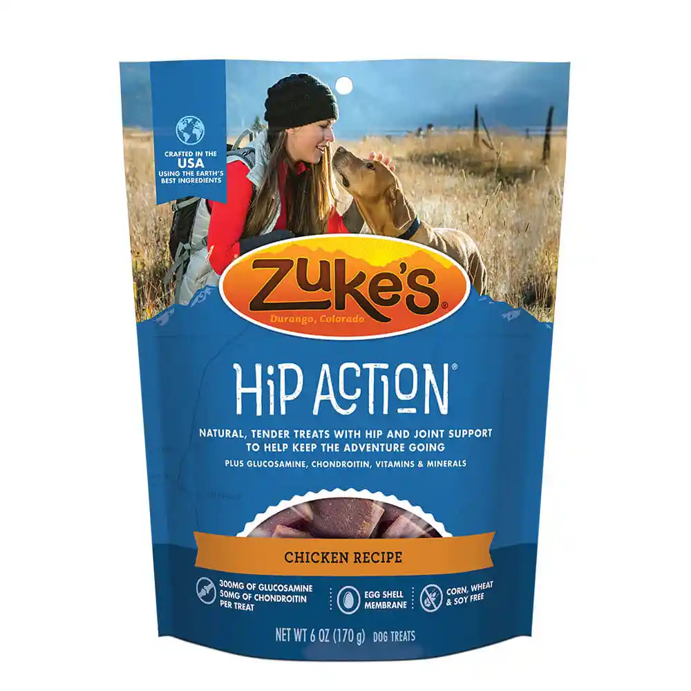 Give your four-legged friend tender pieces of perfection that also support his health with Zuke's Hip Action Chicken Recipe Dog Treats. Life with your dog is one big adventure, and with the right treat, he’ll be by your side every step of the way. These wholesome, bite-size treats feature real chicken as the very first ingredient, with the added benefits of glucosamine, chondroitin and egg shell membrane that support his mobility. They’re crafted right here in the USA without the use of corn, wheat, soy or other fillers. Show him how much you care with these moist, delicious treats and enjoy your long, rewarding journey together.
